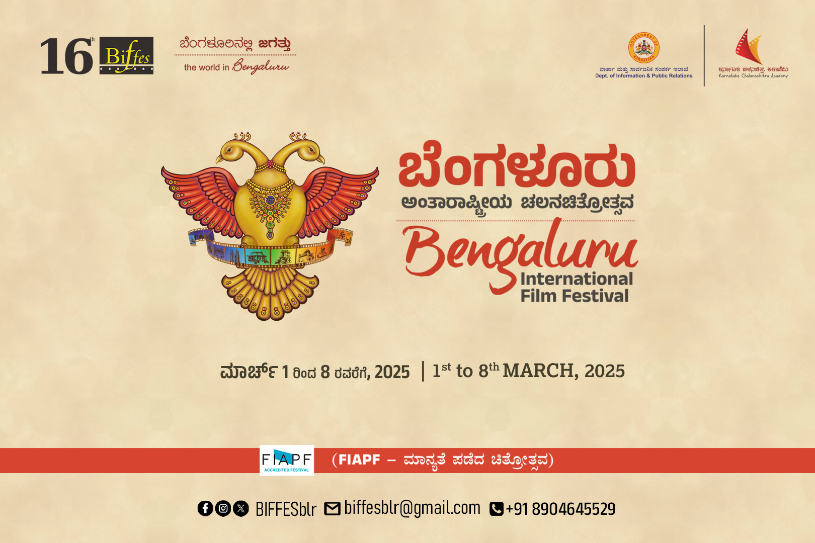 FIAPF Accredited Bengaluru International Film Festival (BIFFes) is being organized by the Karnataka Chalanachitra Academy for the Government of Karnataka. The 16th edition of BIFFes, to be held from 1st – 8th March, 2025. Bengaluru, the capital of Karnataka State in India, is an important centre of International & Indian film culture in keeping with Karnataka’s glorious heritage and the State’s achievements in the fields of literature, fine arts, music and cinema. ‘Universal Peace in Diversity’ is the festival theme for this edition.